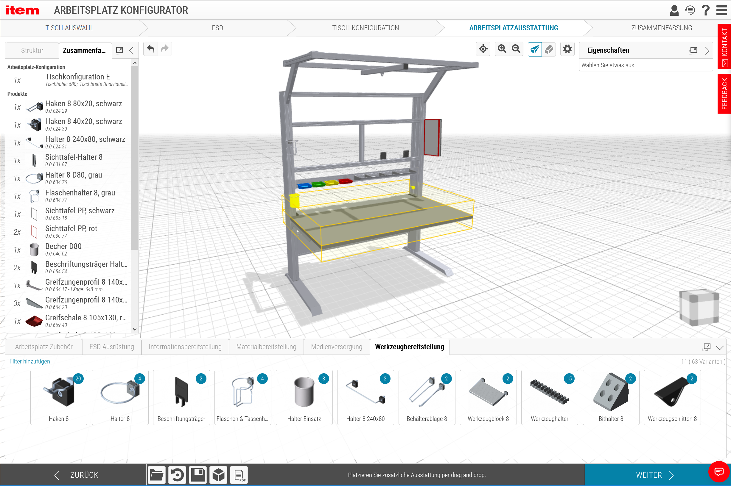 More freedom and flexibility for planning and an interactive 3D work area – item has overhauled its Work Bench Configurator. The new online tool makes the job of creating custom work benches faster and more efficient than ever before. Custom dimensions can now be selected, as well as standard sizes. Work benches can be configured with a whole range of accessories. Even new components from the item ergologistic® product range are included in the portfolio. This means that the handover from intralogistics to further manual processing at the work bench can be executed with optimum ergonomics. Moreover, industrial work benches can also be designed with ESD safety built in. Thanks to the 3D view, users can look at their configured projects from all sides and check them directly.