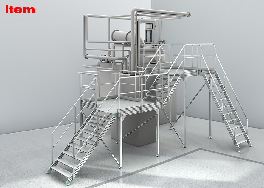 Stairways with steps that feature a rise of 170 mm, a going of 290 mm and a pitch of around 30° are deemed particularly safe. In this white paper, item outlines the basic aspects that should be taken into account at the design stage. In addition to a consistent rise, elements such as adequate step width, anti-slip surfaces and optimum staircase lighting are key to achieving safe stairway designs. Other crucial steps include configuring ideal guard-rails and factoring in maximum weight loads. There are special safety requirements to consider when it comes to stepladders with pitches over 45°. Modular stairway systems such as the item Stairway/Platform System combine the most demanding safety requirements with maximum versatility. Stairways with pitches from 30° to 60° and profiles in variable lengths can be easily adapted to particular specifications. Guard-rails and platforms can also be added to the stairway as appropriate. This means that, depending on the available space and the intended use of the stairway, customers can select the ideal solution for easily and quickly designing bridges, maintenance landings for elevated machine areas, and all-round working platforms.