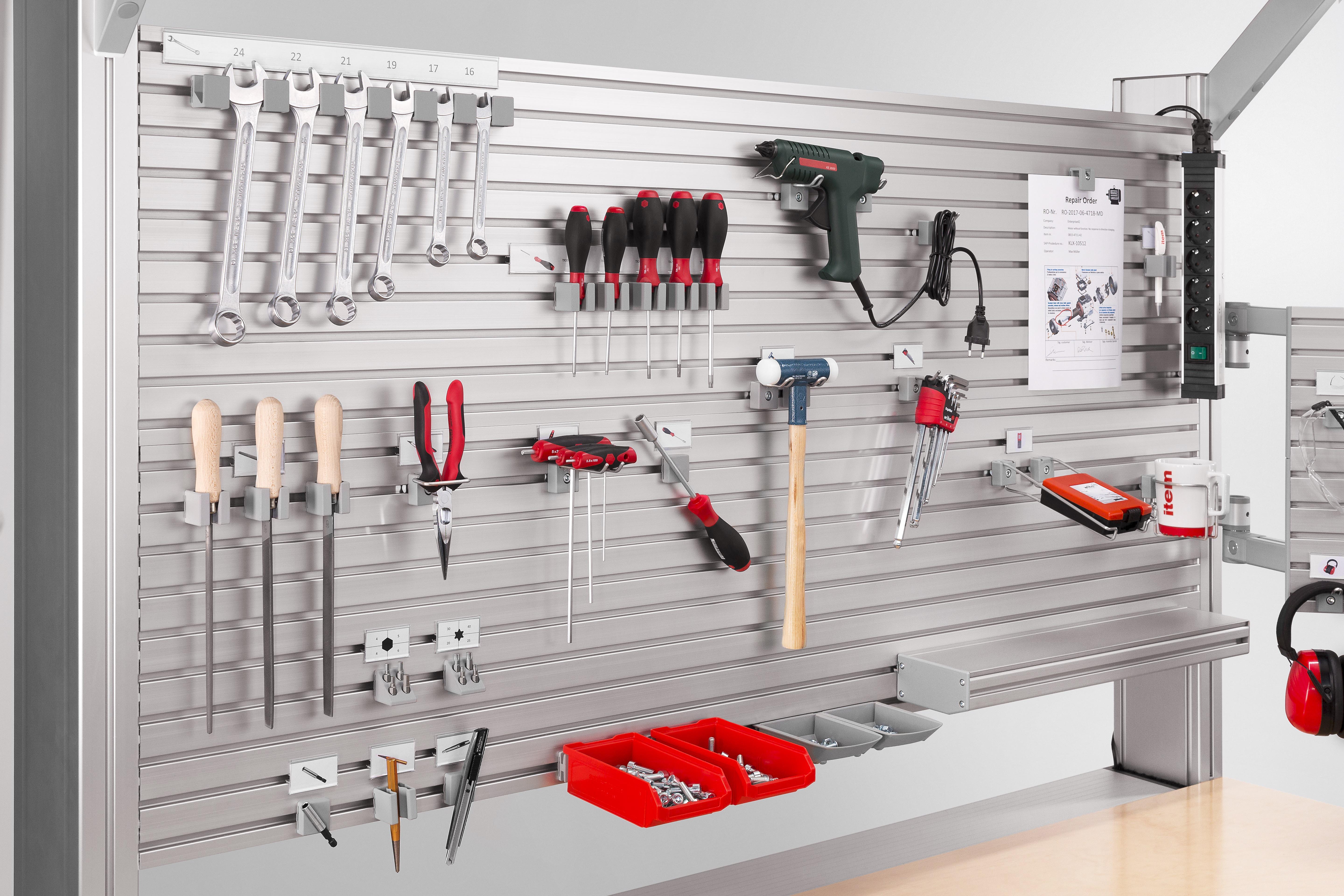 item will also be demonstrating the new Toolpanel System at LogiMAT – another component intended to enhance the ergonomic properties of work bench design. Workers can set up their work benches quickly and perfectly in line with their personal requirements. Groove Plate Profile 8, which is tailored exactly to customer specifications, ensures users can position any tools such as spanners, screwdrivers and tool bits at the optimum height and in the perfect arrangement. All that is required is to fit the corresponding holder into the groove. As the system groove is compatible with other components in the item MB Building Kit System, all other products in the Hook and Holder System, Shelves and other custom fixtures can also be used. In this way, the Toolpanel System ensures work benches are structured and organised.