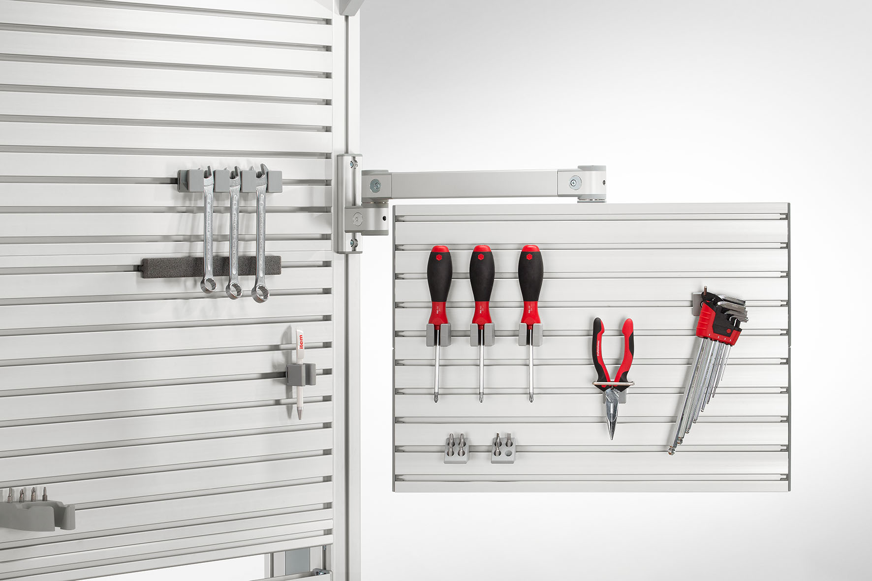 item Pivot Arms and Double Pivot Arms 8 ensure that tools, containers, trays and other resources can be made available at work benches in an ergonomic configuration to suit the user’s specific requirements. The item Work Bench System offers Friction Joints that can be adapted quickly and easily to account for individual needs and different working scenarios, without having to make any compromises on safety. The friction torque can be adjusted with absolute precision so that the Pivot Arm can be moved ergonomically and without much effort while nevertheless remaining stable and staying in the required position. The perfect balance of Pivot Arm 8 ensures ergonomic handling for employees and a reliable hold. If required, the resistance can be adjusted, as users are not tied to a fixed friction torque. If people with different ergonomic requirements working in different shifts are using the same work bench, for example, the friction can be flexibly altered.