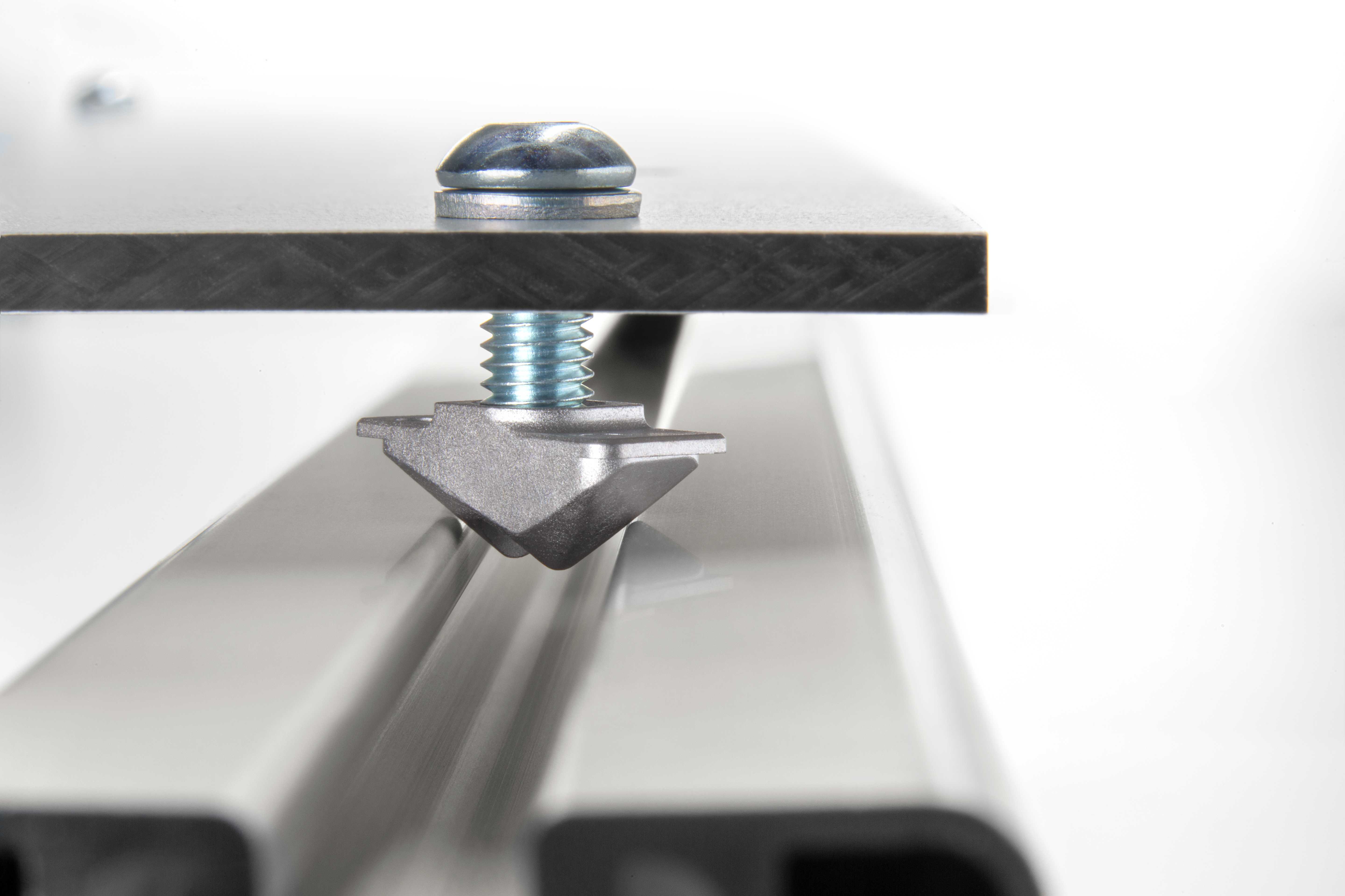 The new components from the item MB Building Kit System speed up and simplify assembly processes. The stainless Automatic T-Slot Nut V 8 St M6 is preassembled with an M6 screw and, when inserted, positions itself in the profile groove entirely independently thanks to its tapered flanks. This eliminates the need to insert and align the T-Slot Nut separately. This comes in particularly useful when working with components that are fixed in place with multiple screws. Thanks to the integrated anti-torsion feature, similar to a Hammerhead Nut, the T-Slot Nut finds the correct position when the screw is tightened and ensures the correct orientation for load transfer. Disassembly can be completed in next to no time, too.