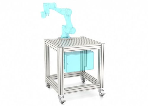 EX-01225Perfectly organised – this robot island with variable Groove Plate for cobots uses Profiles XMS for cable management. All the cables run in the cable conduits, which can be accessed from the outside, and integrating operating elements is easy. Cover Profiles provide a clean, closed outer surface. The frame serves as an under-bench cabinet with flush panelling and door. The seal grooves of the Profiles XMS protect against dust. Depending on the application, the island can be fitted with Castors or Adjustable Feet.